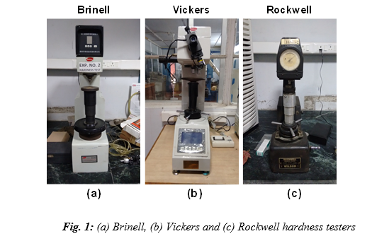 c. Rockwell hardness tester: The Rockwell hardness tester is shown in Fig. 1c. The indenter consists of diamond cone indenter.