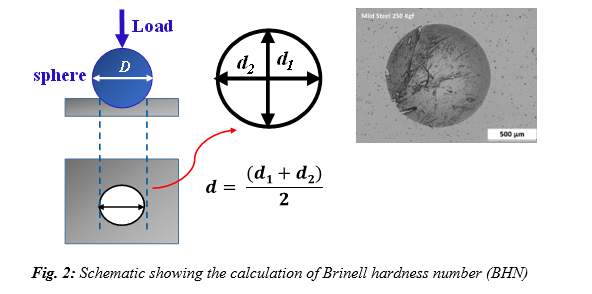 a. Brinell hardness: The diameters (d1 and d2) of the impression left by the indenter in the test material is measured using a microscope, as shown in Fig. 2. Brinell hardness (in BHN) is given by: