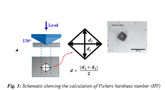 b. Vickers hardness: A very small diamond indenter having pyramidal geometry (angle between opposite faces is 136°) is forced into the surface of the specimen. Applied loads are much smaller than for Rockwell and Brinell, ranging between 1 and 1000 g. The resulting impression is observed under a microscope and diagonals (d1 and d2) are measured, as shown in Fig. 3. Vickers hardness number (in HV) is given by: