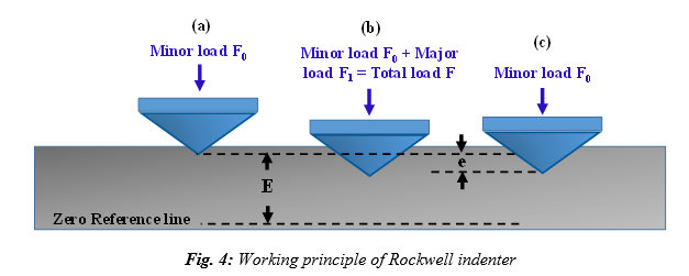 c. Rockwell hardness: The Rockwell hardness test method consists of indenting the test material with a diamond cone or hardened steel ball indenter. The indenter is forced into the test material under a preliminary minor load Fo (Fig. 4a), usually 10 kgf. When equilibrium has reached, an indicating device, which follows the movements of the indenter and so responds to changes in depth of penetration of the indenter, is set to a datum position. While the preliminary minor load is still applied, an additional major load is applied resulting in an increase in the penetration (Fig. 4b). When equilibrium has reached again, the additional major load is removed but the preliminary minor load is still applied. Removal of the additional major load allows a partial recovery, reducing the depth of penetration (Fig. 4c). The permanent increase in the depth of penetration, resulting from the application and removal of the additional major load is used to calculate the Rockwell hardness number (HR). Rockwell indenter automatically provides values of hardness.