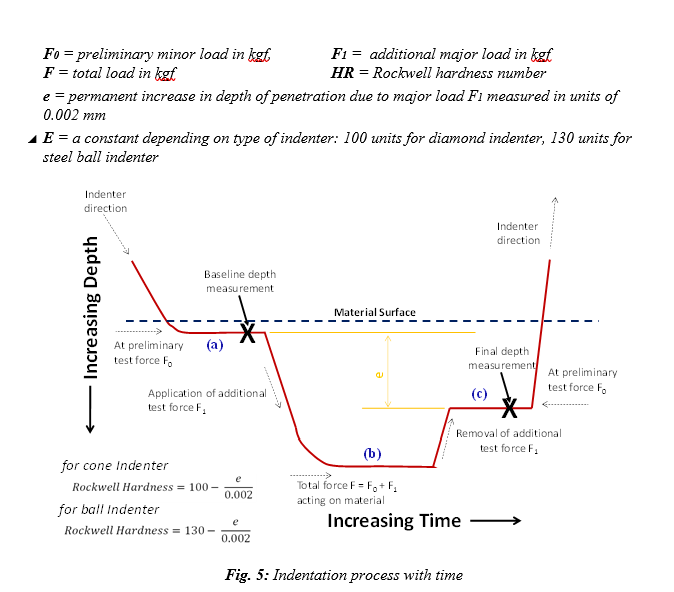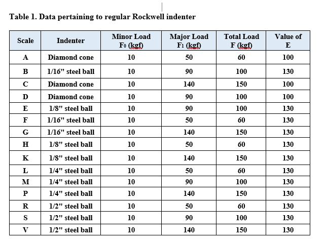 The steps involved in the Rockwell hardness test are shown in Fig. 5. Table 1 shows the data pertaining to regular Rockwell indenter.